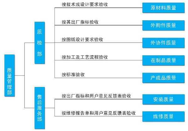 公司设有质量管理部,分为质检部和售后服务部。具体分工及检验标准见下图: